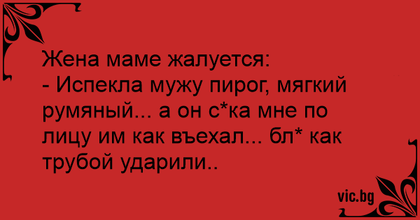 - Испекла мужу пирог, мягкий румяный... а он с*ка мне по лицу им как въехал... бл* как трубой ударили..