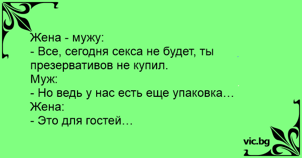 Жінка — чоловікові: — Усе, сьогодні сексу не буде — ти презервативів не купив! Чоловік: — Але ж у нас є ще упаковка. Жінка: — Це для гостей.