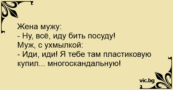 Жена мужу:<br />- Ну, всё, иду бить посуду! <br />Муж, с ухмылкой: <br />- Иди, иди! Я тебе там пластиковую купил... многоскандальную!