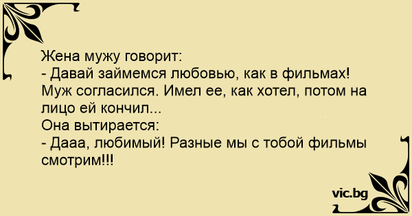 Водење љубов со жената како на филм Жена казва на мъжа: Се враќа мажот од работа дома каде жена му го чека во секси црн долен веш и му вика: Zit een gozer een beetje dwaas voor zich uit te kijken in het café als één van zijn vrienden binnenkomt en naast hem gaat zitten. "wat is er met jou?" vraagt die vriend. "Mijn vriendin heeft het... Дружина чоловікові каже: — Давай займемося коханням, як у фільмах! Чоловік погодився. Трахав її, як хотів, потім на обличчя їй кінчив ... Вона витирається: — Дааа, коханий! Різні ми з тобою фільми...