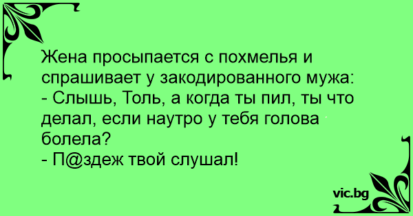 Жена просыпается с похмелья и спрашивает у закодированного мужа:<br />- Слышь, Толь, а когда ты пил, ты что делал, если наутро у тебя голова болела?<br />- П@здеж твой слушал!