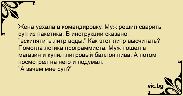 Жена уехала в командировку. Муж решил сварить суп из пакетика. В инструкции сказано: