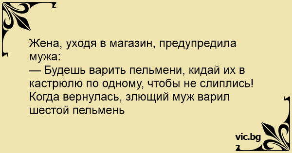 — Будешь варить пельмени, кидай их в кастрюлю по одному, чтобы не слиплись!