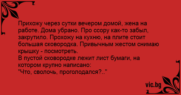 Прихожу через сутки вечером домой, жена на работе. Дома убрано. Про ссору как-то забыл, закрутило. Прохожу на кухню, на плите стоит большая сковородка. Привычным жестом снимаю крышку - посмотреть.