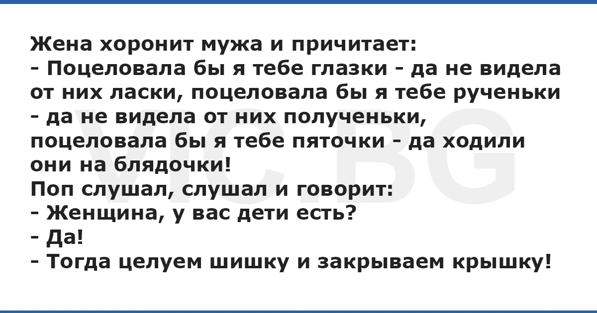 Жена хоронит мужа и причитает: - Поцеловала бы я тебе глазки - да не видела от них ласки, поцеловала бы я тебе рученьки - да не видела от них полученьки, поцеловала бы я тебе пяточки - да ходили они на блядочки! Поп слушал, слушал и говорит: - Женщина, у вас дети есть? - Да! - Тогда целуем шишку и закрываем крышку!
