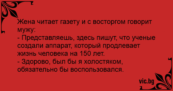 Жената чете списание и с възторг казва на мъжа си: - Представяш ли си, учените са създали уред, с които удължават живота на човек до 150 години!. - Еее, яко, ако бях ерген, щях да го използвам