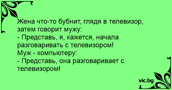 Жена что-то бубнит, глядя в телевизор, затем говорит мужу:<br />- Представь, я, кажется, начала разговаривать с телевизором!<br />Муж - компьютеру:<br />- Представь, она разговаривает с телевизором!