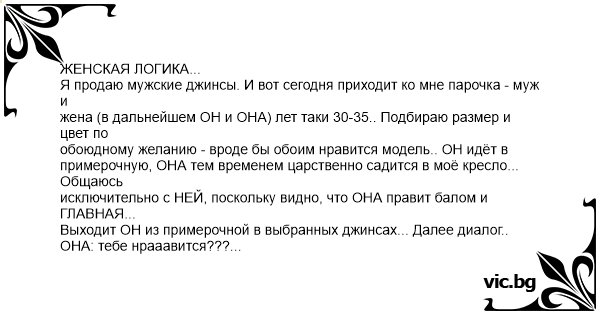 Я продаю мужские джинсы. И вот сегодня приходит ко мне парочка - муж и