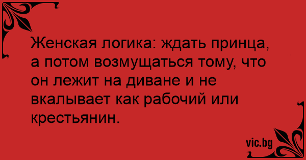 Женская логика: ждать принца, а потом возмущаться тому, что он лежит на диване и не вкалывает как рабочий или крестьянин.
