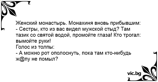 - Сестры, кто из вас видел мужской стыд? Там тазик со святой водой, промойте глаза! Кто трогал: вымойте руки!
