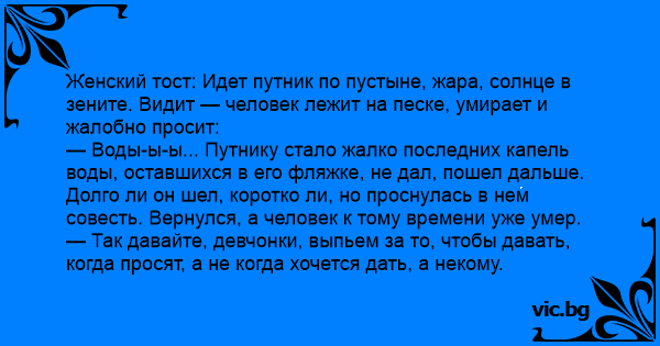 Женский тост: Идет путник по пустыне, жара, солнце в зените. Видит — человек лежит на песке, умирает и жалобно просит:
