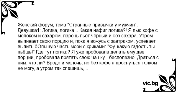 Девушка1: Логика, логика... Какая нафиг логика?! Я пью кофе с молоком и сахаром, парень пьёт чёрный и без сахара. Утром выпивает свою порцию и, пока я вожусь с завтраком, успевает выпить бОльшую часть моей с криками: "Фу, какую гадость ты пьёшь!" Где тут логика? Я уже пробовала делать ему две порции, пробовала прятать свою чашку - бесполезно. Драться с ним, что ли? Вроде и мелочь, но без кофе я проснуться толком не могу, а утром так спешишь, что любая задержка раздражает.