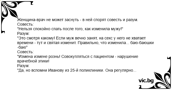 "Да, но вспомни Иванову из 25-й поликлиники. Она регулярно занимается сексом с пациентами - все довольны, всем хорошо".