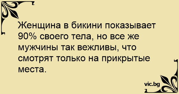 Женщина в бикини показывает 90% своего тела, но все же мужчины так вежливы, что смотрят только на прикрытые места.