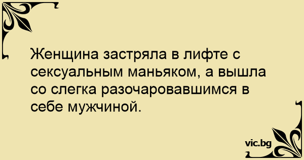 Женщина застряла в лифте с сексуальным маньяком, а вышла со слегка разочаровавшимся в себе мужчиной.