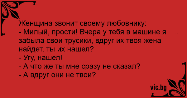 - Милый, прости! Вчера у тебя в машине я забыла свои трусики, вдруг их твоя жена найдет, ты их нашел?