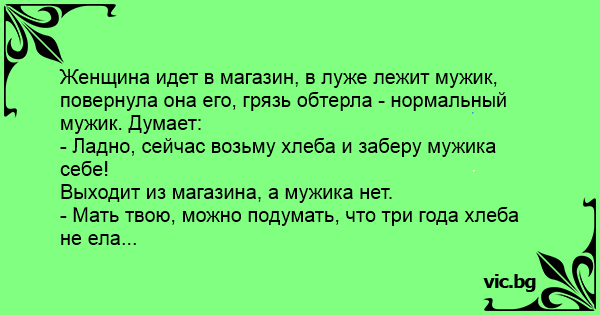 Женщина идет в магазин, в луже лежит мужик, повернула она его, грязь обтерла - нормальный мужик. Думает: