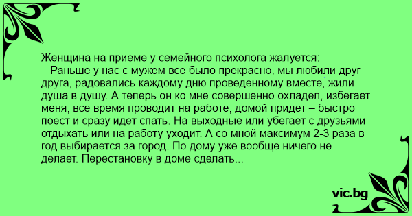 Женщина на приеме у семейного психолога жалуется: – Раньше у нас с мужем все было прекрасно, мы любили друг друга, радовались каждому дню проведенному вместе, жили душа в душу. А теперь он ко мне совершенно охладел, избегает меня, все время проводит на работе, домой придет – быстро поест и сразу идет спать. На выходные или убегает с друзьями отдыхать или на работу уходит. А со мной максимум 2-3 раза в год выбирается за город. По дому уже вообще ничего не делает. Перестановку в доме сделать год не могу допроситься, все время отмахивается. Меня в домохозяйку превратил, на работу не устраивает, требует заниматься детьми, а сам ими не занимается. Ребенка в садик я сама кое-как устроила, а он недоволен, что возить его туда и забирать приходится, хотя он на машине, а мне машину не берет. В магазин надо поехать – бери такси и езжай, на рынок за продуктами надо – с сыном езжай, к сестре в гости – езжай сама, и так всегда, а если и поедет со мной, то с таким недовольным лицом, что жалею о своей просьбе. А я целыми днями как белка в колесе, постоянно убираю, готовлю, стираю, на себя даже времени нет. Превратилась в черт знает что. Сколько его ни прошу начать ремонт дома и в квартире, а он ни в какую, заладил – денег нет, денег нет. Дом уже покрасить пора, во дворе никакого уюта, в огороде деревья постричь и в порядок привести, курятник построить, теплицу сделать прошу, никакого толку, как об стенку горох, только возмущается. Меня уже ничего в жизни не радует. Я постоянно пытаюсь спокойно поговорить с ним обо всем этом, чтоб вместе найти выход, а он не понимает насколько это все важно, кричит мне - хватит ныть, а потом разворачивается и уходит. Плачу уже каждый день из-за всего этого. А он никакого внимания на меня, хотя я всю себя ему отдаю. И так изо дня в день. Сил моих уже нет. Дошло до того, что недавно сон видела, где за мной ухаживал другой мужчина, такой внимательный, отзывчивый, романтичный, нежный и мне было так приятно и уютно, так хорошо, что когда я проснулась, то почти расплакалась от обиды – ну почему у меня нет такого в жизни. Подскажите, что мне делать? – Ну раз муж вас не слушает, попробуйте обсудить все эти проблемы со своим кавалером из сна. Спустя несколько дней. – Я действительно опять видела тот же сон и по вашему совету обсудила свои проблемы с тем человеком. Он такой чуткий и романтичный, сказал, что все это суета сует и мы просто гуляли и занимались любовью. Мне было так хорошо. – Ну это не ответ, так что спросите еще раз, пока не подскажет реальный выход из положения. Спустя полгода. – Доктор, я видела этот сон снова и снова, и каждый раз пыталась рассказать ему о своих проблемах. Бесполезно. Он сначала не обращал внимания или говорил, чтоб я не забивала голову всякой ерундой, затем просил меня не ныть, а теперь вообще перестал являться ко мне во сне.