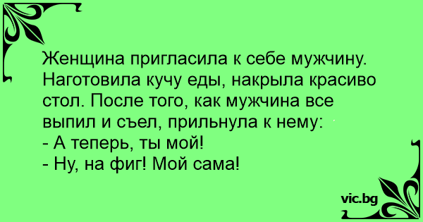 Женщина пригласила к себе мужчину. Наготовила кучу еды, накрыла красиво стол. После того, как мужчина все выпил и съел, прильнула к нему:<br />- А теперь, ты мой! <br />- Ну, на фиг! Мой сама!