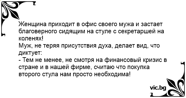 Женщина приходит в офис своего мужа и застает благоверного сидящим на стуле с секретаршей на коленях!