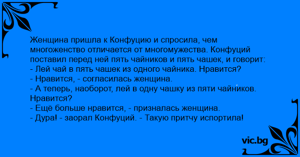 Женщина пришла к Конфуцию и спросила, чем многоженство отличается от многомужества. Конфуций поставил перед ней пять чайников и пять чашек, и говорит: