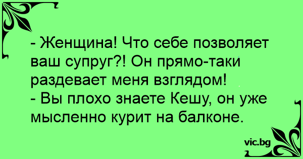 - Женщина! Что себе позволяет ваш супруг?! Он прямо-таки раздевает меня взглядом!<br />- Вы плохо знаете Кешу, он уже мысленно курит на балконе.