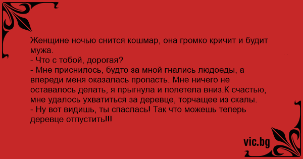 Жінці вночі наснився кошмар, вона голосно кричить і будить свого чоловіка. — Що тобі таке, люба? — Мені наснилось, наче за мною женуться людоїди, а попереду — провалля. Мені не лишалося нічого...