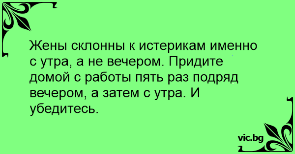 Жены склонны к истерикам именно с утра, а не вечером. Придите домой с работы пять раз подряд вечером, а затем с утра. И убедитесь.