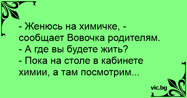 - Женюсь на химичке, - сообщает Вовочка родителям.
