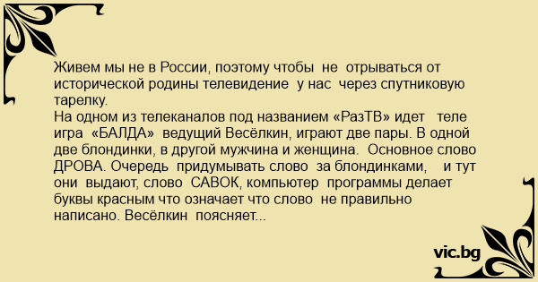 На одном из телеканалов под названием «РазТВ» идет теле игра «БАЛДА» ведущий Весёлкин, играют две пары. В одной две блондинки, в другой мужчина и женщина. Основное слово ДРОВА. Очередь придумывать слово за блондинками, и тут они выдают, слово САВОК, компьютер программы делает буквы красным что означает что слово не правильно написано. Весёлкин поясняет блондинкам что это слово правильно писать через букву «О», СОВОК. Одна из блондинок говорит, «откуда нам с высшим образованием, знать правильное написание слова СОВОК». Ведущий хмыкает, но в ответ предлагает за оставшееся время дать другое слово. Подумав секунд 20 блонды выдают, слово ВОРОС, компьютер опять делает слово красным, Весёлкин просит пояснить, что это за слово. Блондинки, выпятив в презрении нижнюю губу, поясняют «ну у ковра есть ВОРОС», занавес. Большой привет Фурсенко и ЕГЭ!!!!!!!!!!