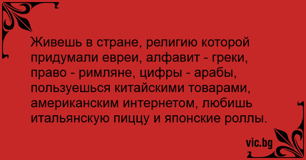 Живешь в стране, религию которой придумали евреи, алфавит - греки, право - римляне, цифры - арабы, пользуешься китайскими товарами, американским интернетом, любишь итальянскую пиццу и японские роллы.