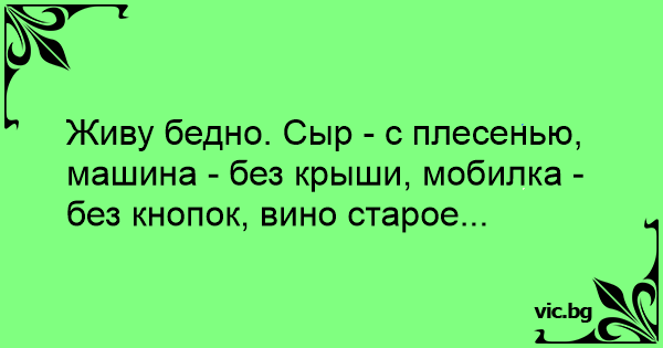 Живу бедно. Сыр - с плесенью, машина - без крыши, мобилка - без кнопок, вино старое...