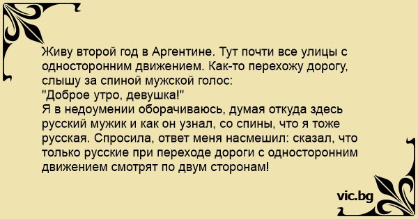 Живу второй год в Аргентине. Тут почти все улицы с односторонним движением. Как-то перехожу дорогу, слышу за спиной мужской голос: