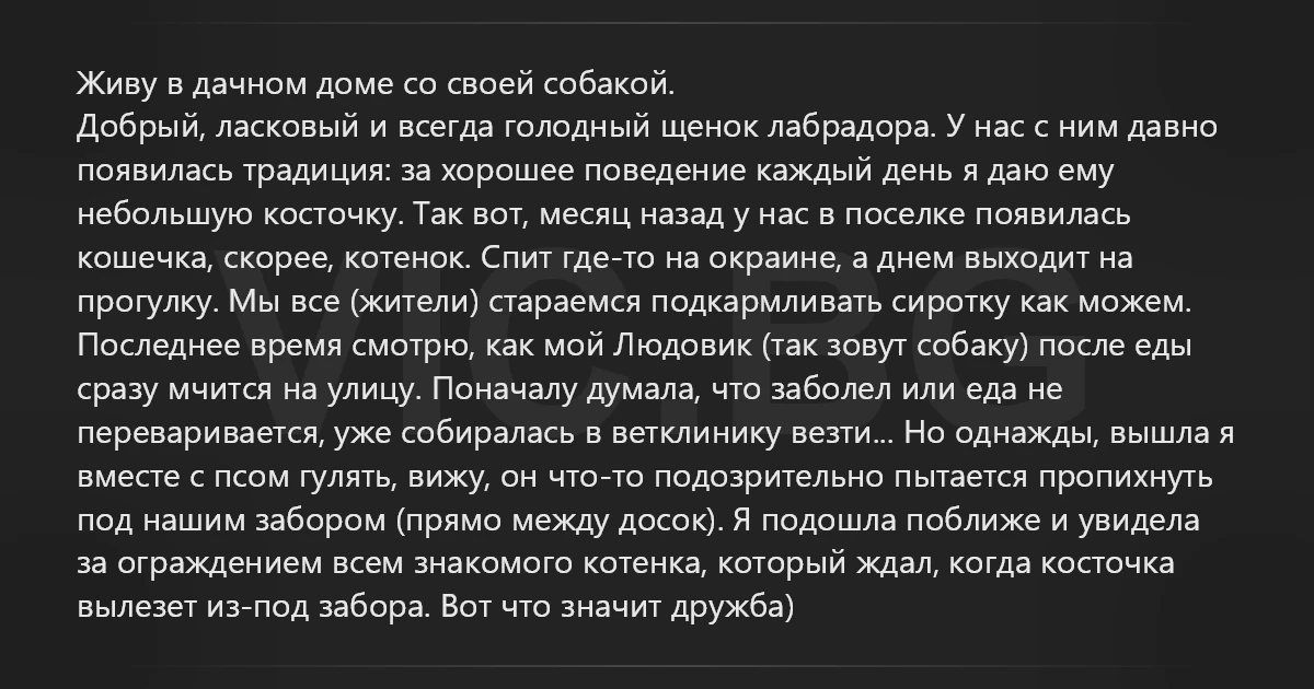 Живу в дачном доме со своей собакой. Добрый, ласковый и всегда голодный щенок лабрадора. У нас с ним давно появилась традиция: за хорошее поведение каждый день я даю ему небольшую косточку. Так вот, месяц назад у нас в поселке появилась кошечка, скорее, котенок. Спит где-то на окраине, а днем выходит на прогулку. Мы все (жители) стараемся подкармливать сиротку как можем. Последнее время смотрю, как мой Людовик (так зовут собаку) после еды сразу мчится на улицу. Поначалу думала, что заболел или еда не переваривается, уже собиралась в ветклинику везти... Но однажды, вышла я вместе с псом гулять, вижу, он что-то подозрительно пытается пропихнуть под нашим забором (прямо между досок). Я подошла поближе и увидела за ограждением всем знакомого котенка, который ждал, когда косточка вылезет из-под забора. Вот что значит дружба)