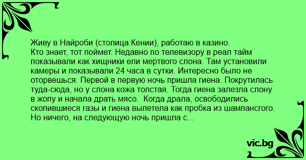 Живу в Найроби (столица Кении), работаю в казино. Кто знает, тот поймет. Недавно по телевизору в реал тайм показывали как хищники ели мертвого слона. Там установили камеры и показывали 24 часа в сутки. Интересно было не оторвешься. Первой в первую ночь пришла гиена. Покрутилась туда-сюда, но у слона кожа толстая. Тогда гиена залезла слону в жопу и начала драть мясо. Когда драла, освободились скопившиеся газы и гиена вылетела как пробка из шампансгого. Но ничего, на следующую ночь пришла с целой стаей. Потом приходили и прилетали сотни зверей и птиц. На четвертый день из зоопарка сбежал наш русский медведь и уж не знаю как тоже добрался до этого слона. Разогнал нахер всех – и гиен и грифов и леопардов и шакалов и ел один пока за ним не приехали и увезли обратно в зоопарк. Давно не испытывала такой гордости за нашу Родину! За шесть дней и ночей от слона не осталось ничего.