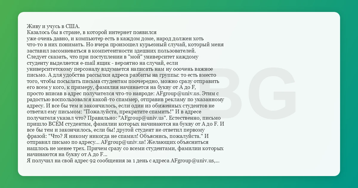 Живу и учусь в США. Казалось бы в стране, в которой интернет появился уже очень давно, и компьютер есть в каждом доме, народ должен хоть что-то в них понимать. Но вчера произошел курьезный случай, который меня заставил засомневаться в компетентности здешних пользователей. Следует сказать, что при поступлении в "мой" университет каждому студенту выделяется e-mail ящик - вероятно на случай, если университетскому персоналу вздумается написать нам ну ооочень важное письмо. А для удобства рассылки адреса разбиты на группы: то есть вместо того, чтобы посылать письма студентам поочередно, можно сразу отправить его всем у кого, к примеру, фамилия начинается на букву от A до F, просто вписав в адрес получателся что-то навроде: AFgroup@univ.us. Этим с радостью воспользовался какой-то спаммер, отправив рекламу по указанному адресу. И все бы тем и закончилось, если один из обиженных студентов не ответил ему письмом: "Пожалуйста, прекратите спамить!" И в адресе получателя указал что? Правильно: "AFgroup@univ.us". Естественно, письмо пришло ВСЕМ студентам, фамилии которых начинаются на букву от A до F. И все бы тем и закончилось, если бы! другой студент не ответил первому фразой: "Что? Я никому никогда не спамил! Объяснись, пожалуйста." И отправил письмо по адресу... AFgroup@univ.us! Желающих объясниться нашлось не менее трех. Причем сразу со всеми студентами, фамилии которых начинаются на букву от A до F... Я получил на свой адрес 92 сообщения за 1 день с адреса AFgroup@univ.us, и лишь последнее из них жалобно просило: "Граждане. Друзья. Не посылайте больше письмо на этот адрес. У меня при получении почты в компьютере звенит звонок. Люди в библиотеке ругаются." :(