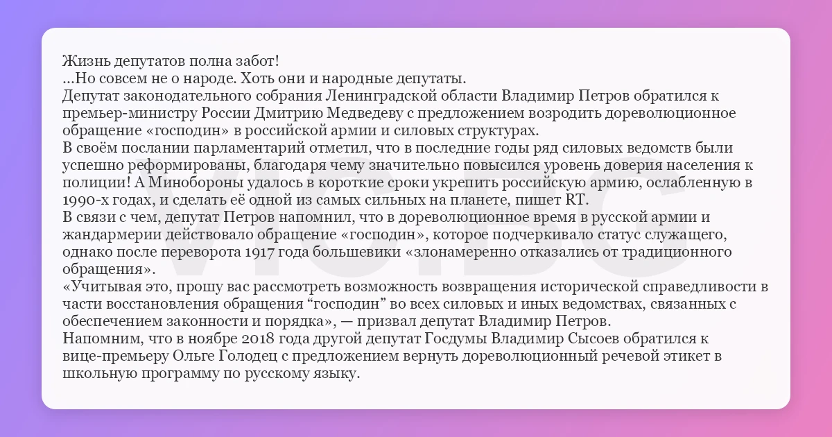 Жизнь депутатов полна забот! ...Но совсем не о народе. Хоть они и народные депутаты. Депутат законодательного собрания Ленинградской области Владимир Петров обратился к премьер-министру России Дмитрию Медведеву с предложением возродить дореволюционное обращение «господин» в российской армии и силовых структурах. В своём послании парламентарий отметил, что в последние годы ряд силовых ведомств были успешно реформированы, благодаря чему значительно повысился уровень доверия населения к полиции! А Минобороны удалось в короткие сроки укрепить российскую армию, ослабленную в 1990-х годах, и сделать её одной из самых сильных на планете, пишет RT. В связи с чем, депутат Петров напомнил, что в дореволюционное время в русской армии и жандармерии действовало обращение «господин», которое подчеркивало статус служащего, однако после переворота 1917 года большевики «злонамеренно отказались от традиционного обращения». «Учитывая это, прошу вас рассмотреть возможность возвращения исторической справедливости в части восстановления обращения “господин” во всех силовых и иных ведомствах, связанных с обеспечением законности и порядка», — призвал депутат Владимир Петров. Напомним, что в ноябре 2018 года другой депутат Госдумы Владимир Сысоев обратился к вице-премьеру Ольге Голодец с предложением вернуть дореволюционный речевой этикет в школьную программу по русскому языку.