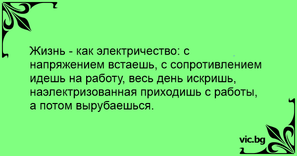 Жизнь - как электричество: с напряжением встаешь, с сопротивлением идешь на работу, весь день искришь, наэлектризованная приходишь с работы, а потом вырубаешься.