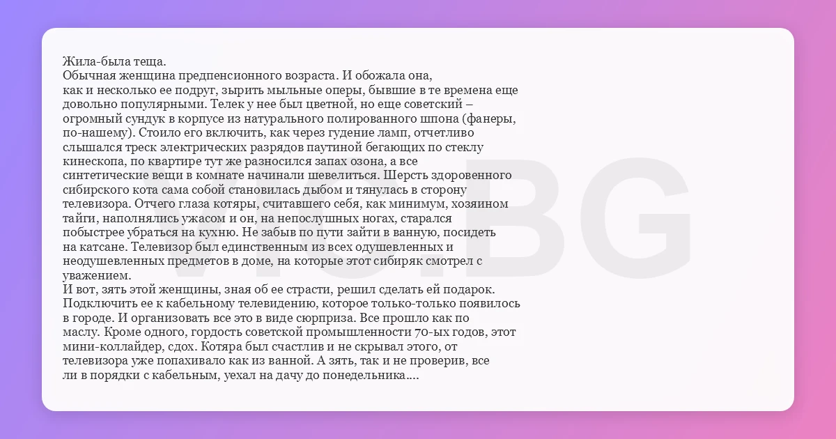 Жила-была теща. Обычная женщина предпенсионного возраста. И обожала она, как и несколько ее подруг, зырить мыльные оперы, бывшие в те времена еще довольно популярными. Телек у нее был цветной, но еще советский – огромный сундук в корпусе из натурального полированного шпона (фанеры, по-нашему). Стоило его включить, как через гудение ламп, отчетливо слышался треск электрических разрядов паутиной бегающих по стеклу кинескопа, по квартире тут же разносился запах озона, а все синтетические вещи в комнате начинали шевелиться. Шерсть здоровенного сибирского кота сама собой становилась дыбом и тянулась в сторону телевизора. Отчего глаза котяры, считавшего себя, как минимум, хозяином тайги, наполнялись ужасом и он, на непослушных ногах, старался побыстрее убраться на кухню. Не забыв по пути зайти в ванную, посидеть на катсане. Телевизор был единственным из всех одушевленных и неодушевленных предметов в доме, на которые этот сибиряк смотрел с уважением. И вот, зять этой женщины, зная об ее страсти, решил сделать ей подарок. Подключить ее к кабельному телевидению, которое только-только появилось в городе. И организовать все это в виде сюрприза. Все прошло как по маслу. Кроме одного, гордость советской промышленности 70-ых годов, этот мини-коллайдер, сдох. Котяра был счастлив и не скрывал этого, от телевизора уже попахивало как из ванной. А зять, так и не проверив, все ли в порядки с кабельным, уехал на дачу до понедельника. Вернувшись, он первым делом отправился к теще. Открыв своим ключом, он вошел в квартиру. И увидел абсолютно растерянную, сбитую с толку тещу. И ее подруг, с суровыми лицами, сжатыми, до побелевших костяшек, кулаками, стиснутыми до скрипа зубами и глазами, в которых полыхал огонь справедливой ярости и желание безжалостного боя. Обстановка была натянута как струна готовая вот-вот лопнуть, запустив кровавую мясорубку… А произошло вот что. Как только телевизор сломался, теща поскребла по сусекам и пошла покупать новый. Пока она шлялась по магазинам, зять провел ей кабельное телевидение. Теща, вернувшись с покупкой, включила … А там, бляха-муха, 60 каналов. Она уж этот телевизор обнимала, целовала везде, во все разъемы. У кота чуть крыша не поехала. А затем давай звонить подругам. Мол, бабоньки, купила новый телевизор – последнее слово техники, японский. Представляете, теперь вместо нескольких каналов он у меня ловит целых шестьдесят. По двадцати из них, круглые сутки, идут фильмы или сериалы. В общем, доставайте заначки, занимайте и дуйте в магазин, там этих телеков всего несколько штук осталось. А так как знают они друг друга с детства – доверие между ними абсолютное, повелись все и сразу. За выходные каждая отоварилась указанным продуктом. А дальше было то, что мы уже знаем. Зять, прибывший весьма вовремя, им все быстренько объяснил. Почему ему оставили жизнь? Неизвестно. Может, он знал какие-нибудь особенно трогательные мольбы о пощаде. А женское сердце – оно ведь не камень. А может еще что. Но к кабельному ТВ все подключились.