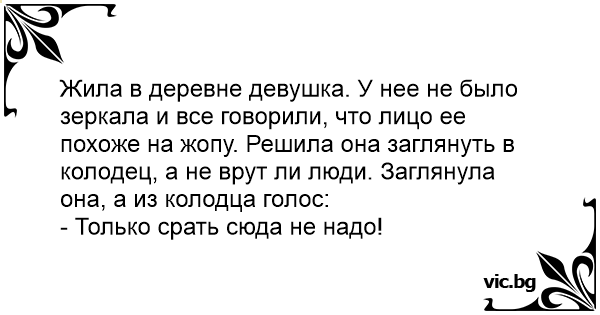 Жила в деревне девушка. У нее не было зеркала и все говорили, что лицо ее похоже на жопу. Решила она заглянуть в колодец, а не врут ли люди. Заглянула она, а из колодца голос: