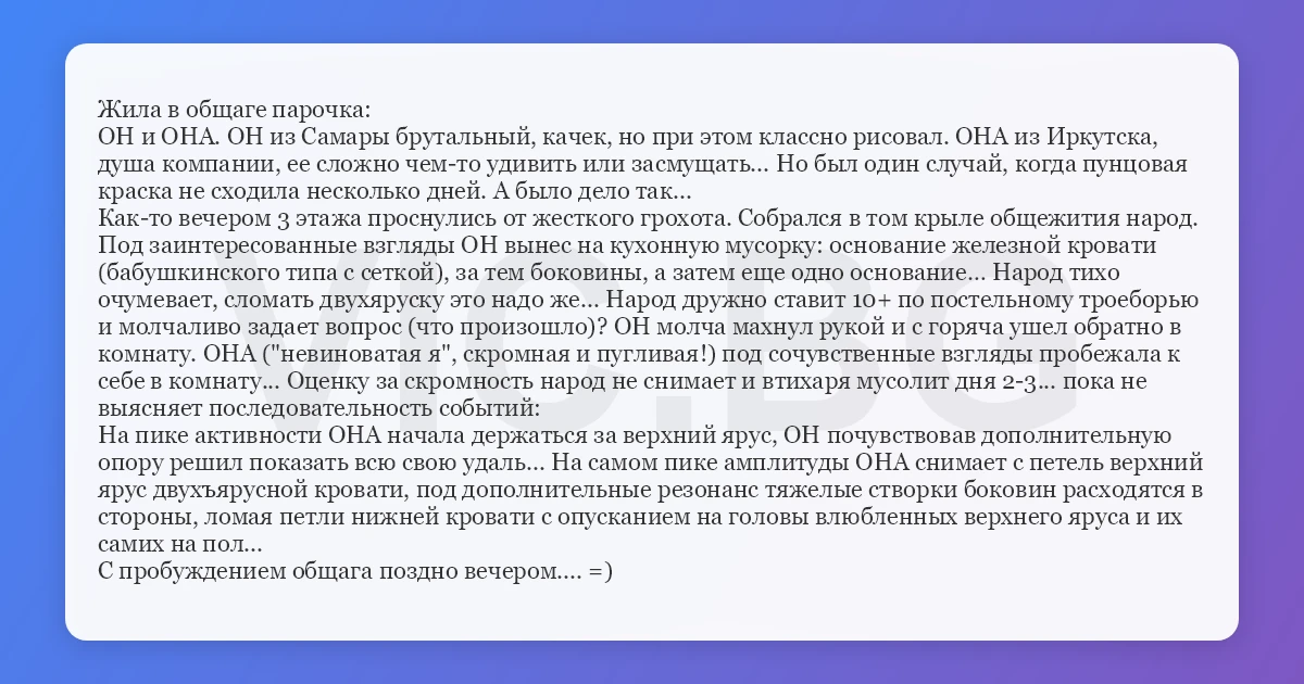 Жила в общаге парочка: ОН и ОНА. ОН из Самары брутальный, качек, но при этом классно рисовал. ОНА из Иркутска, душа компании, ее сложно чем-то удивить или засмущать... Но был один случай, когда пунцовая краска не сходила несколько дней. А было дело так... Как-то вечером 3 этажа проснулись от жесткого грохота. Собрался в том крыле общежития народ. Под заинтересованные взгляды ОН вынес на кухонную мусорку: основание железной кровати (бабушкинского типа с сеткой), за тем боковины, а затем еще одно основание… Народ тихо очумевает, сломать двухяруску это надо же... Народ дружно ставит 10+ по постельному троеборью и молчаливо задает вопрос (что произошло)? ОН молча махнул рукой и с горяча ушел обратно в комнату. ОНА ("невиноватая я", скромная и пугливая!) под сочувственные взгляды пробежала к себе в комнату... Оценку за скромность народ не снимает и втихаря мусолит дня 2-3... пока не выясняет последовательность событий: На пике активности ОНА начала держаться за верхний ярус, ОН почувствовав дополнительную опору решил показать всю свою удаль... На самом пике амплитуды ОНА снимает с петель верхний ярус двухъярусной кровати, под дополнительные резонанс тяжелые створки боковин расходятся в стороны, ломая петли нижней кровати с опусканием на головы влюбленных верхнего яруса и их самих на пол... С пробуждением общага поздно вечером.... =)
