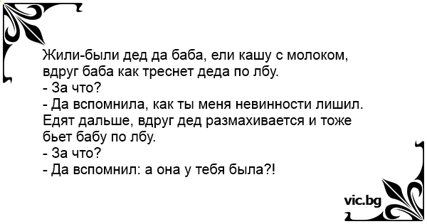 Жили-были дед да баба, ели кашу с молоком, вдруг баба как треснет деда по лбу.