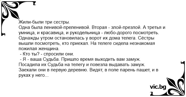 - Вот это - твой, - говорит Судьба первой из сестёр.
