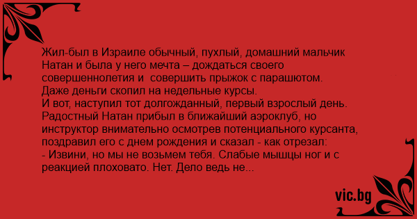 Жил-был в Израиле обычный, пухлый, домашний мальчик Натан и была у него мечта – дождаться своего совершеннолетия и совершить прыжок с парашютом.