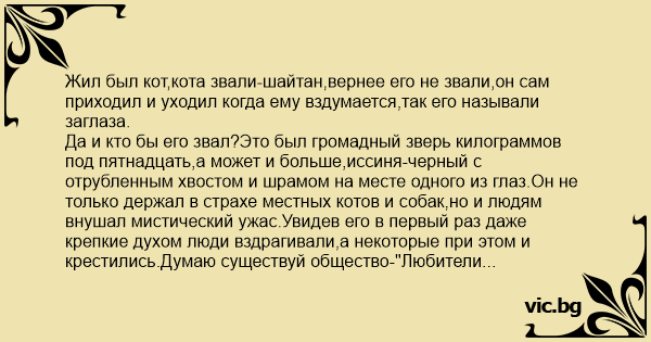 Жил был кот,кота звали-шайтан,вернее его не звали,он сам приходил и уходил когда ему вздумается,так его называли заглаза.