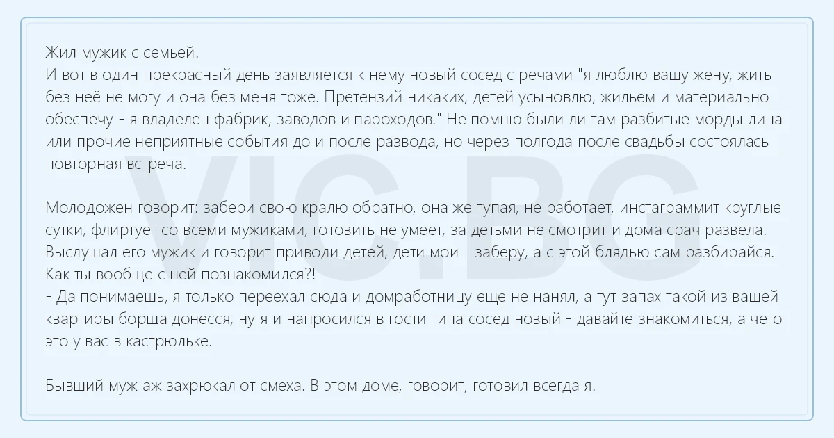 Молодожен говорит: забери свою кралю обратно, она же тупая, не работает, инстаграммит круглые сутки, флиртует со всеми мужиками, готовить не умеет, за детьми не смотрит и дома срач развела. Выслушал его мужик и говорит приводи детей, дети мои - заберу, а с этой блядью сам разбирайся. Как ты вообще с ней познакомился?! - Да понимаешь, я только переехал сюда и домработницу еще не нанял, а тут запах такой из вашей квартиры борща донесся, ну я и напросился в гости типа сосед новый - давайте знакомиться, а чего это у вас в кастрюльке.