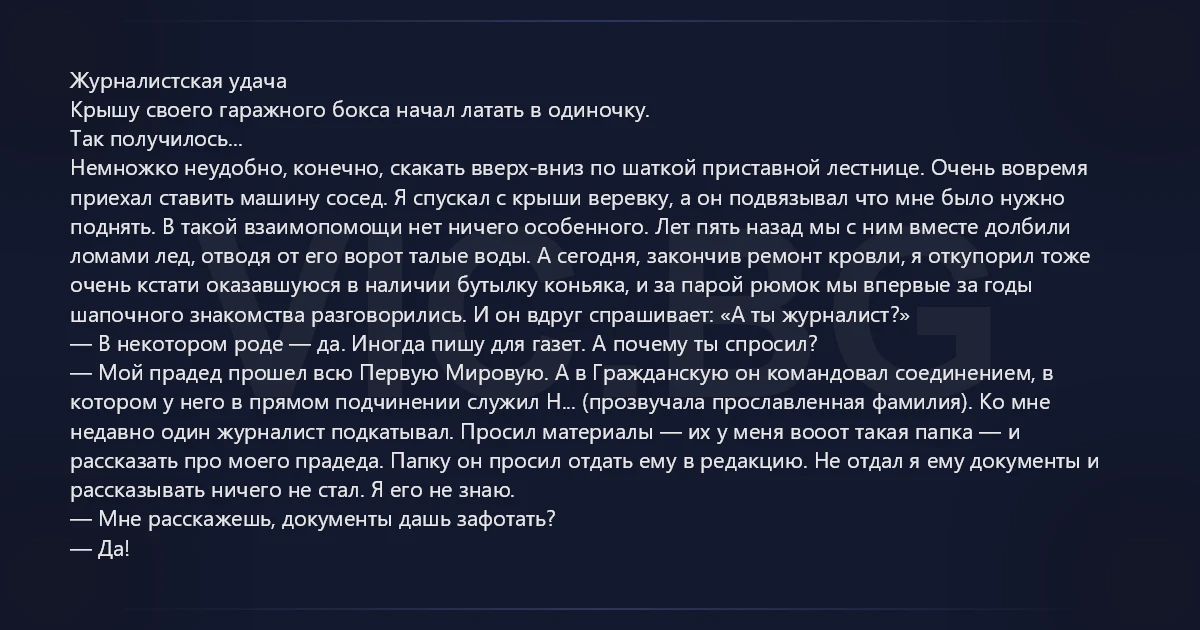Немножко неудобно, конечно, скакать вверх-вниз по шаткой приставной лестнице. Очень вовремя приехал ставить машину сосед. Я спускал с крыши веревку, а он подвязывал что мне было нужно поднять. В такой взаимопомощи нет ничего особенного. Лет пять назад мы с ним вместе долбили ломами лед, отводя от его ворот талые воды. А сегодня, закончив ремонт кровли, я откупорил тоже очень кстати оказавшуюся в наличии бутылку коньяка, и за парой рюмок мы впервые за годы шапочного знакомства разговорились. И он вдруг спрашивает: «А ты журналист?»