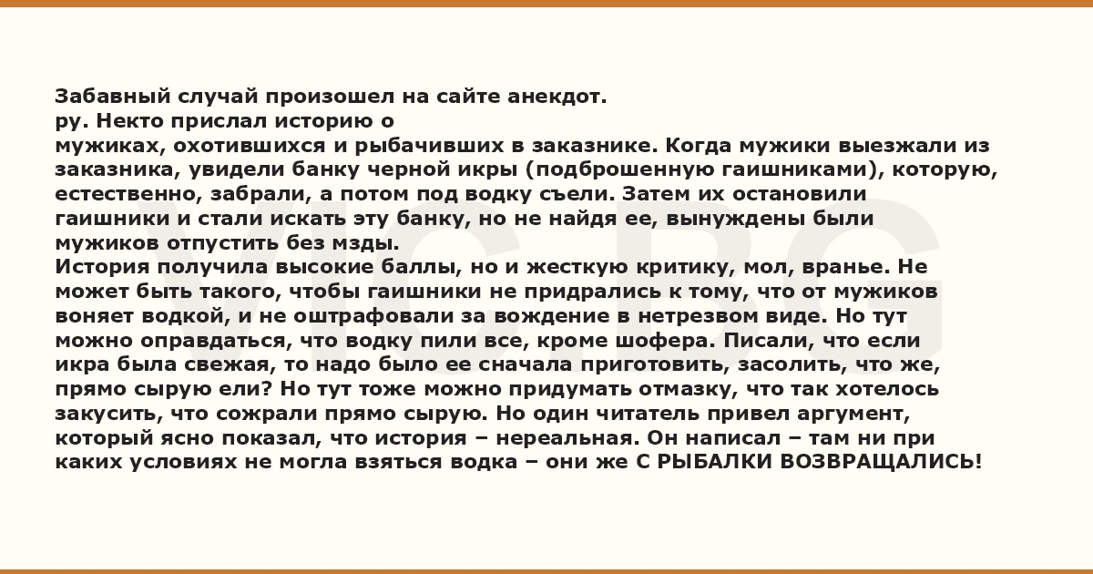 Забавный случай произошел на сайте анекдот. ру. Некто прислал историю о мужиках, охотившихся и рыбачивших в заказнике. Когда мужики выезжали из заказника, увидели банку черной икры (подброшенную гаишниками), которую, естественно, забрали, а потом под водку съели. Затем их остановили гаишники и стали искать эту банку, но не найдя ее, вынуждены были мужиков отпустить без мзды. История получила высокие баллы, но и жесткую критику, мол, вранье. Не может быть такого, чтобы гаишники не придрались к тому, что от мужиков воняет водкой, и не оштрафовали за вождение в нетрезвом виде. Но тут можно оправдаться, что водку пили все, кроме шофера. Писали, что если икра была свежая, то надо было ее сначала приготовить, засолить, что же, прямо сырую ели? Но тут тоже можно придумать отмазку, что так хотелось закусить, что сожрали прямо сырую. Но один читатель привел аргумент, который ясно показал, что история – нереальная. Он написал – там ни при каких условиях не могла взяться водка – они же С РЫБАЛКИ ВОЗВРАЩАЛИСЬ!