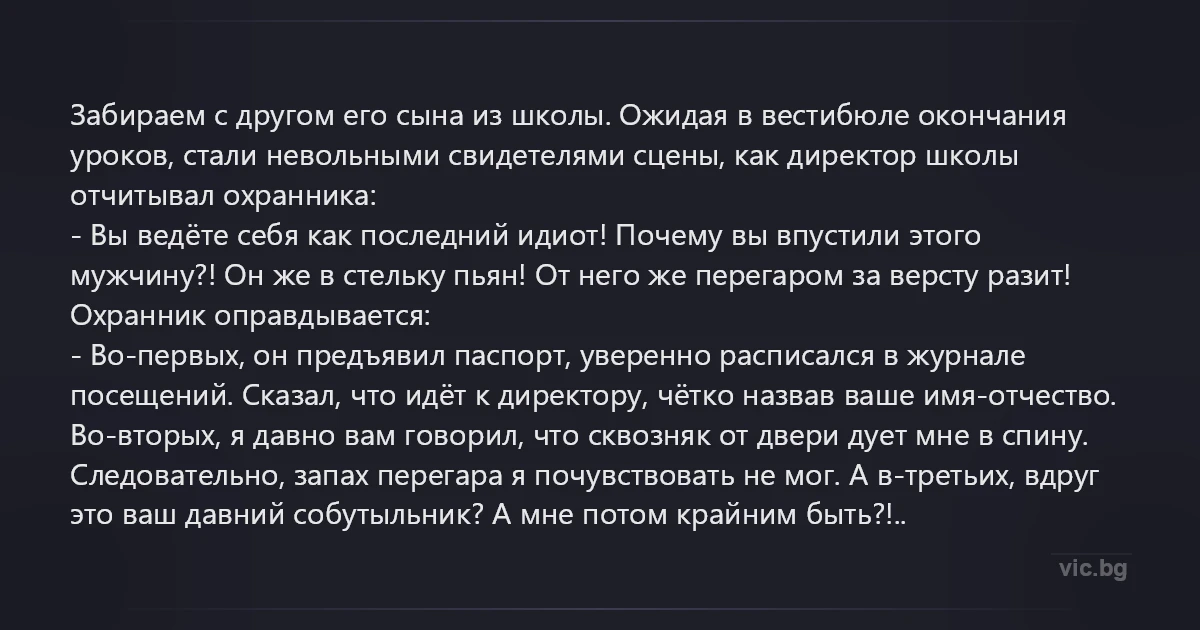- Во-первых, он предъявил паспорт, уверенно расписался в журнале посещений. Сказал, что идёт к директору, чётко назвав ваше имя-отчество. Во-вторых, я давно вам говорил, что сквозняк от двери дует мне в спину. Следовательно, запах перегара я почувствовать не мог. А в-третьих, вдруг это ваш давний собутыльник? А мне потом крайним быть?!..