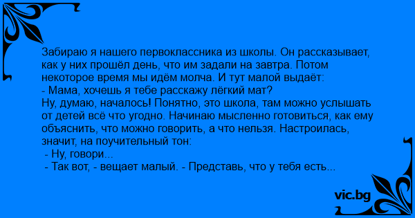 Ну, думаю, началось! Понятно, это школа, там можно услышать от детей всё что угодно. Начинаю мысленно готовиться, как ему объяснить, что можно говорить, а что нельзя. Настроилась, значит, на поучительный тон: